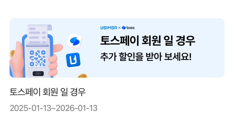 현재 토스페이 회원일 경우 유심사 할인 쿠폰을 받을 수 있습니다.